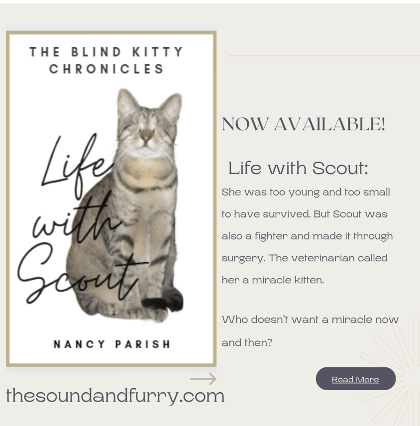 I hear the sounds of paws scampering across the floor. This time, there’s a THUMP, followed by a low growl. I recognize the sound. It’s Hermione. She growls at Scout when they are play-fighting. I’m still trying to figure out if she’s mad or if she’s playing. I sometimes wonder if she’s figured out that Scout can’t see, and is doing her best to include her. That growl could be Hermione’s way of telling Scout where she is. I like to think my cats only have good intentions.